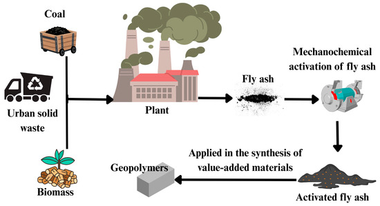 The graphical diagram shows the process of incinerating coal, municipal solid waste, and biomass in thermoelectric plants. This process produces fly ash as a byproduct. Fly ash can undergo mechanochemical activation to produce active fly ash, which, in turn, is used in the production of highly useful and value-added functional materials.