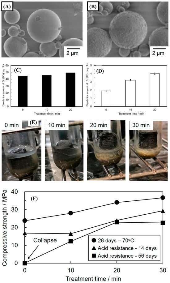 SEM images of coal fly ash (A) before, (B) after mechanical treatment, Dissolution amount of (C) Si (IV) and (D) Al (III) ions from coal fly ash, (E) appearance of geopolymers after 56 days of the acid resistance test: room temperature curing for 28 days. From left to right, mechanical treatment times are 0, 10, 20, and 30 min, respectively, and (F) Compressive strength of geopolymers (28 days, 70 °C cured) from mechanically treated coal fly ash after acid resistant test (14 and 56 days). Reprinted with permission from Matsuoka et al. [62]. Copyright 2019 MDPI and under the Creative Commons CC BY license.