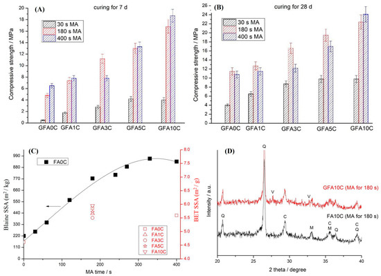(A) Effect of calcite content and MA time on the 7-day compressive strength of geopolymers. (B) Effect of calcite content and MA time on the 28-day compressive strength of geopolymers. (C) The X-ray diffraction patterns of the blend containing 10% CaCO3 (FA10C) milled for 180 s and of the geopolymer prepared using this blend after 28 d of curing (GFA10C). Phases marked: Q—quartz; M—mullite; C—calcite; V—vaterite. (D) Blaine-specific surface area (SSA) of the fly ash (black symbols) and Brunauer–Emmett–Teller (BET) SSA of the FA + CaCO3 blends milled for 180 s (red open symbols) vs. mechanochemical activation (MA) time. One Reprinted with permission from Kalinkin et al. [15]. Copyright 2020 MDPI and Adapted from Kalinkin et al. (2020) under the Creative Commons CC BY license.