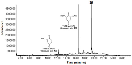 The same methodology was applied to a beechwood lignin. The Gas Chromatography coupled to Mass Spectrometry (GC-MS) analysis highlighted the formation of 3,5-dimethoxyquinone as the major monomer (2.5 wt%), along with 2-methoxybenzoquinone (0.5 wt%) (Figure 7). Furthermore, when the reaction was carried out on 10 g of beechwood lignin, gel permeation chromatography showed a strong reduction in molecular weight, demonstrating that the lignin was successfully depolymerized. Overall, this study demonstrates that this oxidative protocol can be applied on a large scale to biomass.