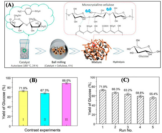A solid carbonaceous acid catalyst functionalized with -SO3H group by co-carbonization of sucralose was synthesized by Qiu et al. [87] and studied its efficiency in converting cellulose to glucose in pure water (Figure 8A). It was established by the study that the mixture of cellulose with the catalyst prepared by ball milling, used in the cellulose hydrolysis process provided a glucose yield of 52.8% in pure water at 200 °C in 1 h, and the glucose yields increased to 71.9% and 88.0% when it was diluted in 0.02% by weight of H2SO4 and hydrochloric acid (HCl) (with the same proton content) aqueous solutions, respectively, (Figure 8B). Furthermore, the prepared solid carbonaceous acid catalyst exhibited relatively stable catalytic activity over five cycles (Figure 8C). According to this study, the excellent catalytic activity for the production of glucose from cellulose was attributed to the reduced degree of crystallinity of cellulose and the improved contact between the active sites and the β-1,4-glycosidic bonds in cellulose during the cellulose and solid acid milling process. The work provided a promising strategy for high-yield glucose production from cellulose hydrolysis in aqueous solutions and offers broad application for transforming lignocellulosic biomass into valuable chemicals.