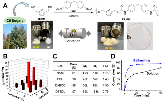 Schematic illustration of PU synthesis using diols derived from biomass (A). Screening of ball-milling polymerization with BHMF and MDI (B) by controlling frequency and reaction time, and (C) with several catalysts. The reaction with the DBTDL catalyst at 20 Hz for 60 min yielded the highest Mw PU. (D) Comparison of conversion achieved with ball-milling vs. solution synthesis of PU as a function of the reaction time. Reprinted with permission from Oh et al. [89]. Copyright 2020 American Chemical Society.