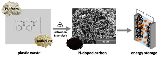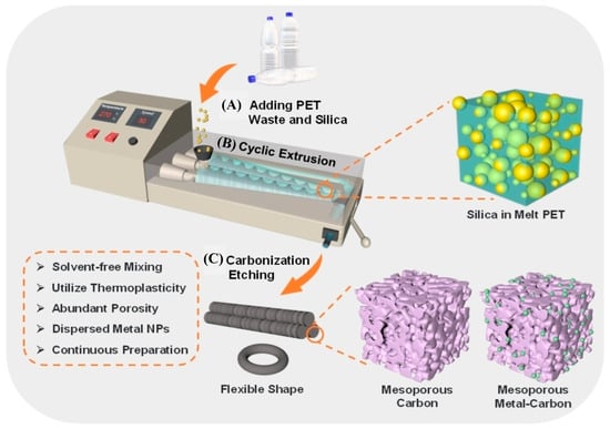 The development of functional materials through the mechanochemical treatment of polymer waste is driving the growth of this research area, offering new concepts for waste management across various industries. In this context, the production of mesoporous carbon materials is particularly attractive for polymer waste-based synthesis, as these materials serve as effective catalyst supports due to their inert nature. They are widely used in reactions such as hydrodeoxygenation, nitrogen reduction, hydrogen evolution, and oxygen evolution. Carbon-based structures can be synthesized from PET waste, as reported by Xu et al. [112]. In this study, functional porous carbons with variable shapes formed in situ and with high surface areas (up to 1001 m2/g) were obtained after carbonization and chemical attack (Figure 11). Furthermore, metallic Mo species were impregnated in a well-dispersed form into the porous carbons through solvent-free extrusion to support solid catalyst design particles (Mo2C@MC). The results indicated that Mo2C@MC not only has good catalytic performance in the reduction reaction of 4-nitrophenol (4-NP) to 4-aminophenol (4-AP), but also the linearity of ln(C/C0) over time was consistent with pseudo-first-order kinetics with an apparent rate constant (Kapp) of 0.5812 min−1 (Figure 12).