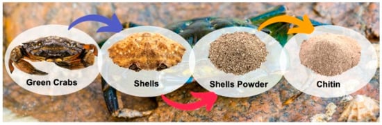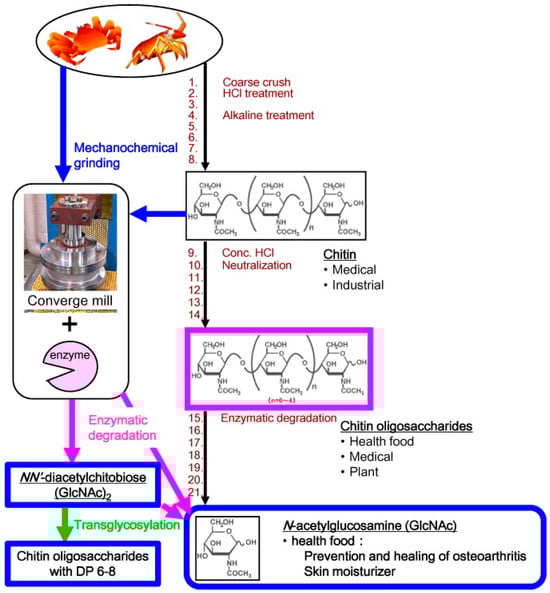 - Nakagawa, Y.S.; Oyama, Y.; Kon, N.; Nikaido, M.; Tanno, K.; Kogawa, J.; Inomata, S.; Masui, A.; Yamamura, A.; Kawaguchi, M.; et al. Development of Innovative Technologies to Decrease the Environmental Burdens Associated with Using Chitin as a Biomass Resource: Mechanochemical Grinding and Enzymatic Degradation. Carbohydr. Polym. 2011, 83, 1843–1849. [Google Scholar] [CrossRef]