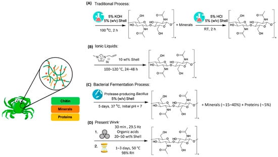- Chen, X.; Yang, H.; Zhong, Z.; Yan, N. Base-Catalysed, One-Step Mechanochemical Conversion of Chitin and Shrimp Shells into Low Molecular Weight Chitosan. Green Chem. 2017, 19, 2783–2792. [Google Scholar] [CrossRef]