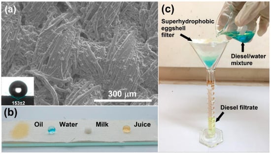 - Seeharaj, P.; Sripako, K.; Promta, P.; Detsri, E.; Vittayakorn, N. Facile and Eco-friendly Fabrication of Hierarchical Superhydrophobic Coating from Eggshell Biowaste. Int. J. Appl. Ceram. Technol. 2019, 16, 1895–1903. [Google Scholar] [CrossRef]
