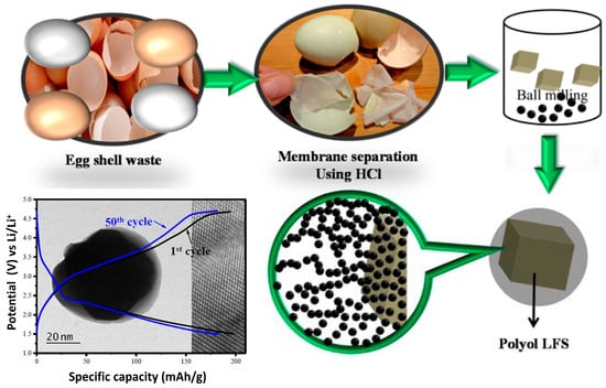 - Karuppiah, D.; Palanisamy, R.; Ponnaiah, A.; Liu, W.-R.; Huang, C.-H.; Rengapillai, S.; Marimuthu, S. Eggshell-Membrane-Derived Carbon Coated on Li2FeSiO4 Cathode Material for Li-Ion Batteries. Energies 2020, 13, 786. [Google Scholar] [CrossRef]
