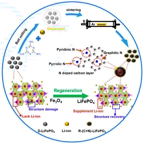 - Gou, Y.; Qi, C.; Li, R.; Liu, X.; Zhou, Z.; Zhang, M.; Sun, Q.; Song, L.; Jin, Y. Direct Regeneration of High-Value LiFePO4 Cathode Materials with Nitrogen Doped Carbon Coating. Electrochim. Acta 2024, 488, 144180. [Google Scholar] [CrossRef]