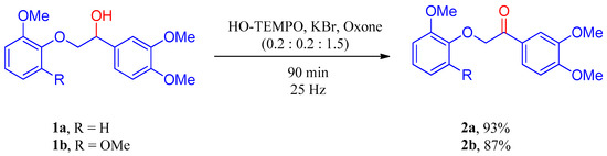 On the other hand, Dabral et al. [78] reported a mechanochemically activated oxidation of beech lignin using HO–TEMPO, KBr, and Oxone® in the ratio 0.2:0.2:1.5 and using tungsten carbide (WC) as grinding medium. In this study, mechanochemical oxidation of model compounds, methoxy-substituted monolignol derivatives, 1a and 1b proved to be successful, as it provided the corresponding ketones 2a and 2b in 93% and 87% yields, respectively, after purification by column chromatography (Scheme 2).