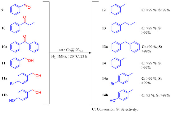 - Zhang, P.; Chen, N.; Chen, D.; Yang, S.; Liu, X.; Wang, L.; Wu, P.; Phillip, N.; Yang, G.; Dai, S. Ultra-Stable and High-Cobalt-Loaded Cobalt@Ordered Mesoporous Carbon Catalysts: All-in-One Deoxygenation of Ketone into Alkylbenzene. ChemCatChem 2018, 10, 3299–3304. [Google Scholar] [CrossRef]