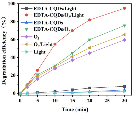 HQ degradation efficiency in different systems. Reaction conditions: initial Ph = 6, T = 25 °C, HQ = 100 mg L−1, EDTA-CQDs = 0.2 g/L, Xe = 26.54 mW cm−2, O3 = 0.1 L/h (80%).