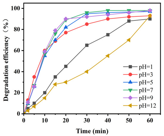 Subsequently, the reaction conditions were adjusted by using 3 mol/L NaOH/HCl to alter the initial pH of the reaction system. As shown in Figure 2, in the EDTA-CQD photogenerated H2O2/ O3 system, the initial pH of the reaction affected the degradation rate, but, in the pH range of 1–12, the degradation percentage of each system exceeded 90% after 60 min of reaction. The acidic environment can provide more protons and promote the formation of H2O2, accelerating the degradation process in the initial stage of the reaction. H2O2 rapidly generated and decomposed to produce free radicals, activating O3 for degradation. However, an excessively low pH environment (pH 1) inhibited O3 decomposition, resulting in a lower reaction rate. In a strongly alkaline condition (pH 12), O3 self-decomposition dominated initially, while ·OH radicals were quenched under alkaline conditions, hindering oxidation reactions. However, the intermediate products of HQ degradation are acidic, so, as the reaction progressed, the system pH gradually decreased, and a certain degradation efficiency was maintained. Within the pH range of 5–9, H2O2 and O3 exhibited efficient synergistic interactions, with dual reaction mechanisms of direct attack by O3 and oxidation by free radicals derived from O3 decomposition. It can be seen that the composite system exhibits high degradation ability in a wide pH range (1–12) by coordinating H2O2 production and O3 decomposition. It not only utilizes the advantages of an acidic environment for H2O2 generation but also has a strengthening effect on the two degradation mechanisms of O3 (direct oxidation by O3 and indirect oxidation by ·OH), exhibiting strong adaptability to complex pH conditions in water treatment. This approach provides a solution for handling pollutants with varying pH levels in practical applications.