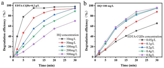 HQ degradation efficiency of EDTA-CQD-based H2O2/O3 system under different HQ concentrations (a) and EDTA-CQDs dosages (b). Reaction conditions: T = 25 °C, Xe = 26.54 mW cm−2, O3 = 0.1 L/h (80%).