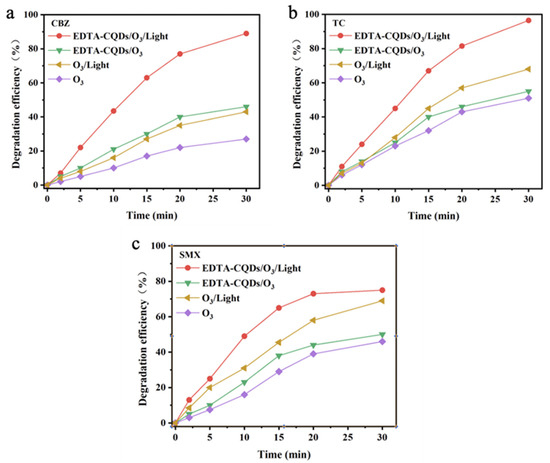 To verify the universality of the EDTA-CQD-based H2O2/O3 system for the treatment of various new organic pollutants, three environmentally persistent contaminants with significant structural differences were tested (Figure 4). Among them, CBZ contains nitrogen heterocycles and conjugated structures, TC has polycyclic frameworks and polar functional groups, and SMX contains sulfonamide groups and heterocycles. They were used to comprehensively investigate the degradation ability of the EDTA-CQD-based H2O2/O3 system on nitrogen-containing heterocycles, polycyclic structures, and polar functional groups. The experiments verified the effectiveness of the composite system in cleaving various chemical bonds, including C-N bonds, C-O bonds, and π bonds in the benzene ring, thereby confirming its broad applicability in treating complex wastewater.