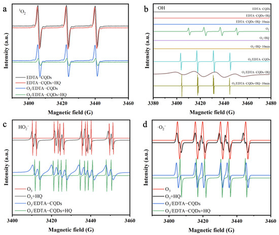An analysis of reactive oxygen species (ROS) in different reaction systems using EPR spin trapping revealed that the system without O3 (Figure 5a,b) showed no ·OH signals, indicating that the H2O2 generated by EDTA-CQD photocatalysis did not decompose into highly reactive ·OH radicals. After adding pollutants, there was no significant change in the signal of 1O2, suggesting that 1O2 is not the primary species responsible for HQ degradation. In the photo-EDTA-CQDs/O3 system, the observed decrease in 1O2 signals after the addition of pollutant may result from the quenching effects caused by the massive generation of ·OH radicals.