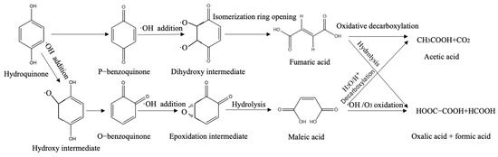 Therefore, the degradation path of HQ in the EDTA-CQD-based H2O2/O3 system is speculated as follows (Figure 6): (i) O3 electrophilic attacks the adjacent or para carbon atoms of the phenolic hydroxyl group on hydroquinone (the electron cloud density of the adjacent and para positions is higher), forming covalent bonds and rapidly rebounding to form p-benzoquinone. The ·OH radical is added to the adjacent carbon atom of the phenolic hydroxyl group through an addition reaction, and the intermediate formed by the addition reaction undergoes further oxidation while triggering electron rearrangement within the molecule. During the electronic rearrangement process, the chemical bonds on the benzene ring break and recombine, gradually transforming the original hydroquinone structure into the ortho-benzoquinone structure. Phenolic hydroxyl is oxidized to carbonyl (C=O), and the position of the double bond on the benzene ring also changes accordingly, generating o-benzoquinone. (ii) The p-benzoquinone is added by ·OH radicals to form a dihydroxy intermediate, which then undergoes intramolecular electron rearrangement to form fumaric acid (trans-butenedioic acid). The o-benzoquinone is attacked by · OH at the double bond position (alpha position) to form an epoxidation intermediate, which is then hydrolyzed to form maleic acid (cis-butenedioic acid). (iii) Maleic acid (cis) is more easily hydrolyzed and decarboxylated to produce acetic acid, or oxidized and cleaved to produce oxalic acid and formic acid. Fumaric acid (trans) tends to undergo oxidative decarboxylation to directly generate acetic acid, or to generate oxalic acid and formic acid under strong hydrolysis conditions. The final products are all low-molecular-weight carboxylic acids, which can be further mineralized into CO2 and H2O.
