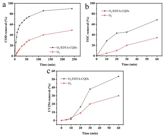 Removal percentages of COD (a), TOC (b), and UV254 (c) in landfill leachate treated with O3 and EDTA-CQDs/O3 under illumination conditions. Raw water parameters: COD = 6800 mg/L, TOC = 1772.6 mg/L, pH = 6.54 (diluted 10 times); reaction conditions: initial pH = 7.54, T=25 °C, EDTA-CQDs = 0.2 g/L, Xe = 26.54 mW·cm−2, O3 = 0.1 L/h (80%).