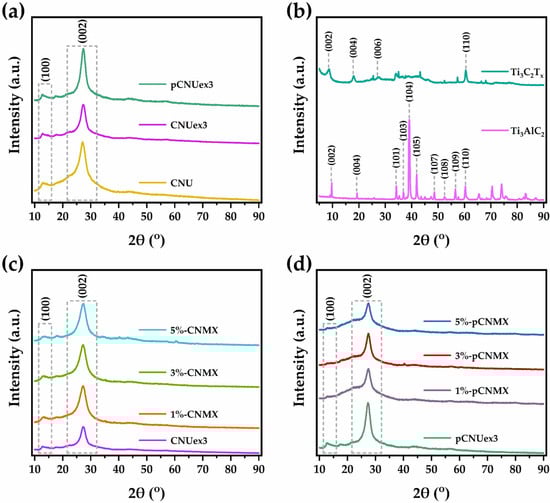 X-ray diffractograms of the synthesized (a) CNU, CNUex3, pCNUex3, (b) Ti3AlC2, Ti3C2Tx, (c) x%-CNMX, and (d) x%-pCNMX (x = 1, 3, 5).