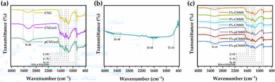 ATR-FTIR spectra of the synthesized (a) CNU, CNUex3, pCNUex3, (b) Ti3C2Tx, (c) x%-CNMX, and x%-pCNMX (x = 1, 3, 5).