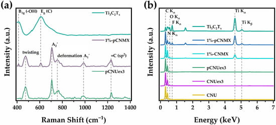 (a) Raman spectra of Ti3C2Tx, pCNUex3, and 1%-pCNMX, as well as (b) EDS spectra of CNU, CNUex3, pCNUex3, 1%-CNMX, 1%-pCNMX, and Ti3C2Tx.