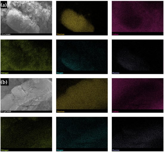 EDS elemental maps of (a) 1%-CNMX and (b) 1%-pCNMX showing the presence of titanium, carbon, nitrogen, oxygen, and fluorine on the surface of these materials.