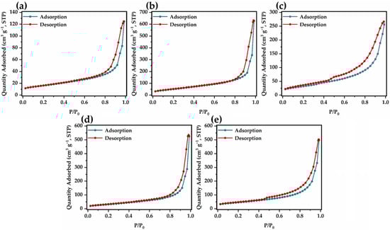 Nitrogen adsorption–desorption isotherms of the synthesized (a) CNU, (b) CNUex3, (c) pCNUex3, (d) 1%-CNMX, and (e) 1%-pCNMX.