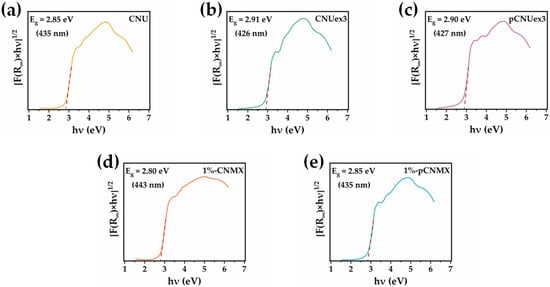 Tauc plots and determined Eg for the synthesized (a) CNU, (b) CNUex3, (c) pCNUex3, (d) 1%-CNMX, and (e) 1%-pCNMX.