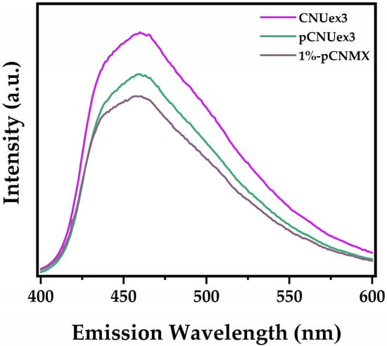 PL spectra of CNUex3, pCNUex3, and 1%-pCNMX were obtained using a Horiba FluoroMax-4 spectrofluorometer (Lyon, France). The photocatalysts were excited with 320 nm monochromatic radiation, and emission spectra were recorded from 400–600 nm with a 1 nm step.