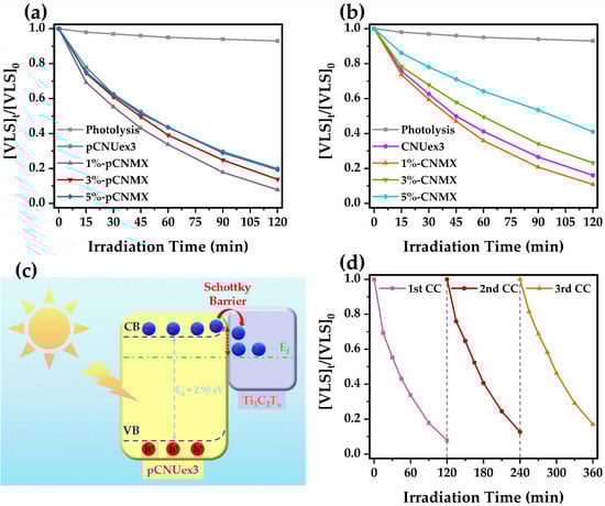 Photocatalytic degradation kinetics of VLS (5 mg L−1) using the synthesized (a) CNUex3, x%-CNMX, (b) pCNUex3, and x%-pCNMX (100 mg L−1) in the presence of simulated solar light (I = 500 W m−2). (c) Schematic representation of the Schottky junction formed between pCNUex3 and Ti3C2Tx MXene. (d) Photocatalytic degradation cycles of VLS (5 mg L−1) using 1%-pCNMX (100 mg L−1) in the presence of simulated solar light (I = 500 W m−2).