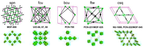 Schematic presentation of selected Zr-MOF topological nets, where spn, fcu, bcu, ftw, and csq represent the topology of sodalite, face-centered cubic, body-centered cubic, Fluorite, and cubic square net, respectively [82]. (Copyright © 2016 American Chemical Society).