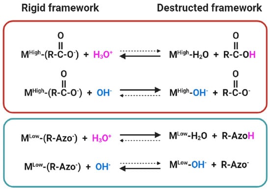 Metal–ligand substitution reactions between MOFs and protons/hydroxides. Mhigh and Mlow denote high- and low-valence metal nodes, respectively. Solid arrows represent a more favored process, and dashed arrows represent a less favored process [93]. (Copyright © 2012 WILEY-VCH Verlag GmbH & Co. KGaA, Weinheim, Germany).