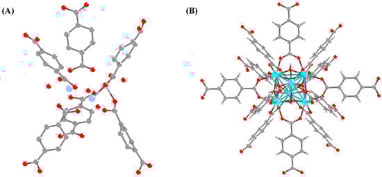 Secondary building unit of (A) MIL-101-Cr (in linkage of 6 organic linkers) and (B) UiO-66 (in linkage of 12 organic linkers), where C, O, Cr, Zr, and H are grey, red, blue, light turquoise, and white atoms, respectively.