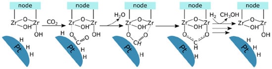 Schematic presentation of the reaction mechanism of CO2 hydrogenation to HCOO intermediate in CH3OH formation at the Pt-Zr node interface [120] (Copyright © 2019 American Chemical Society).