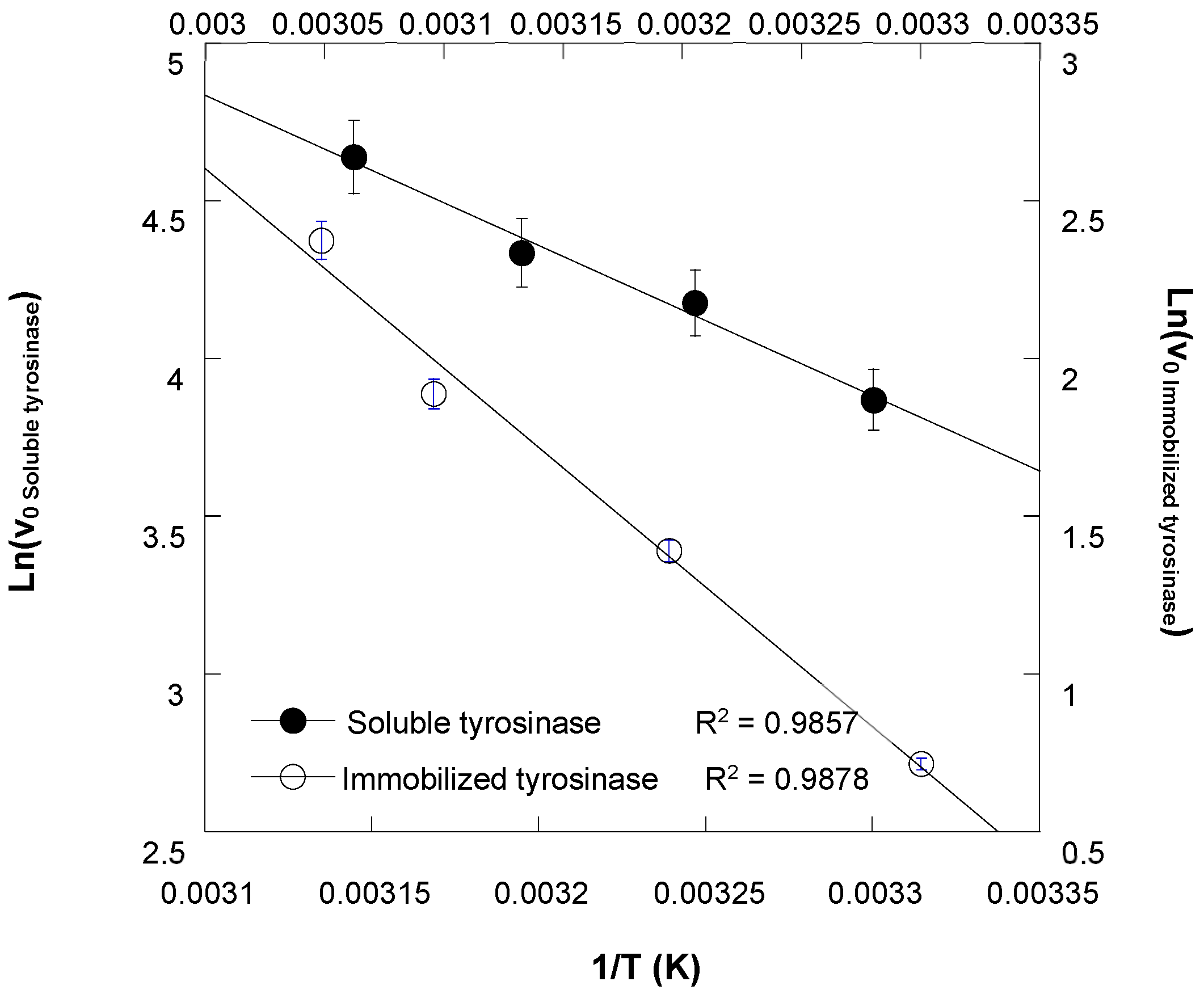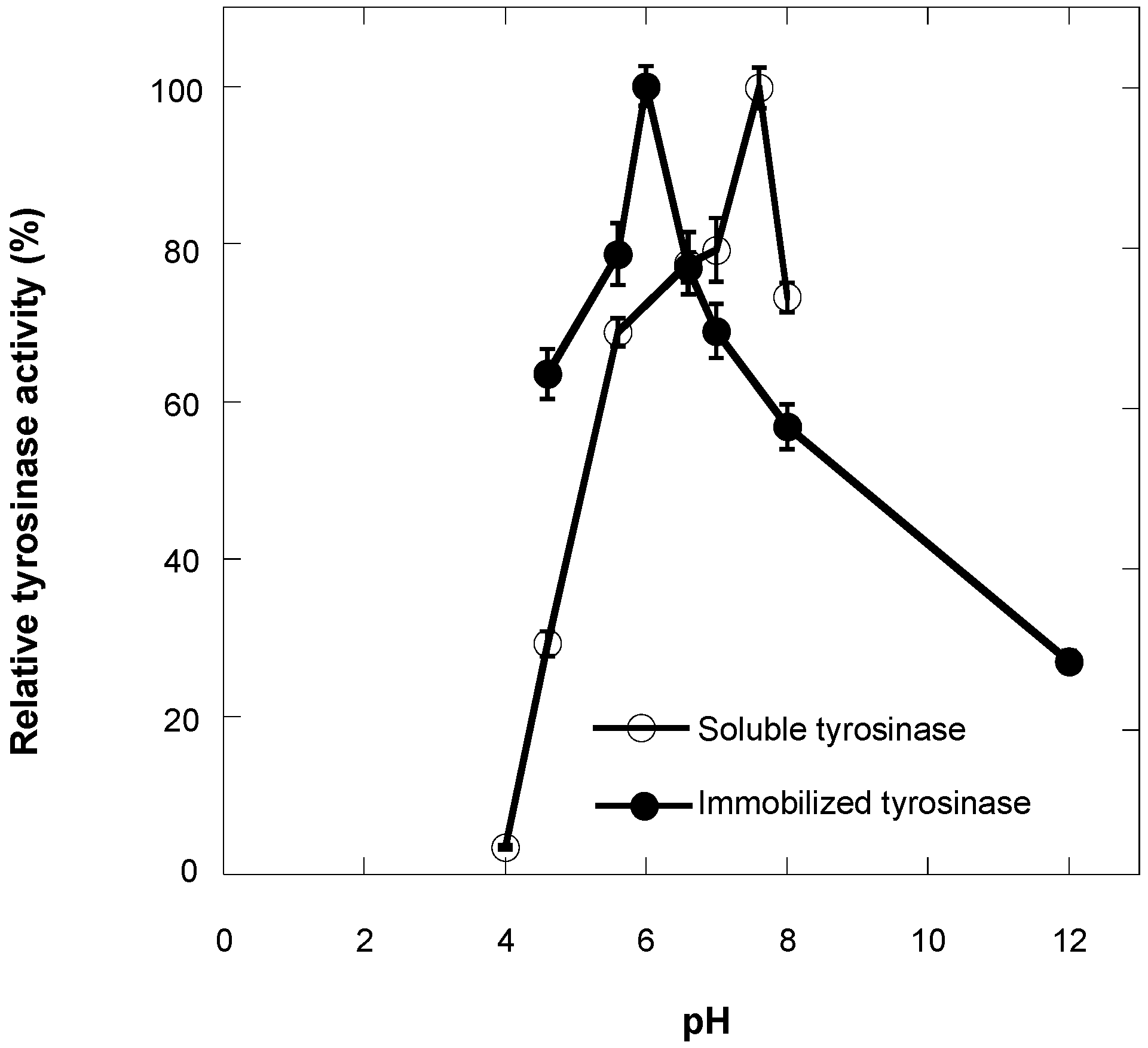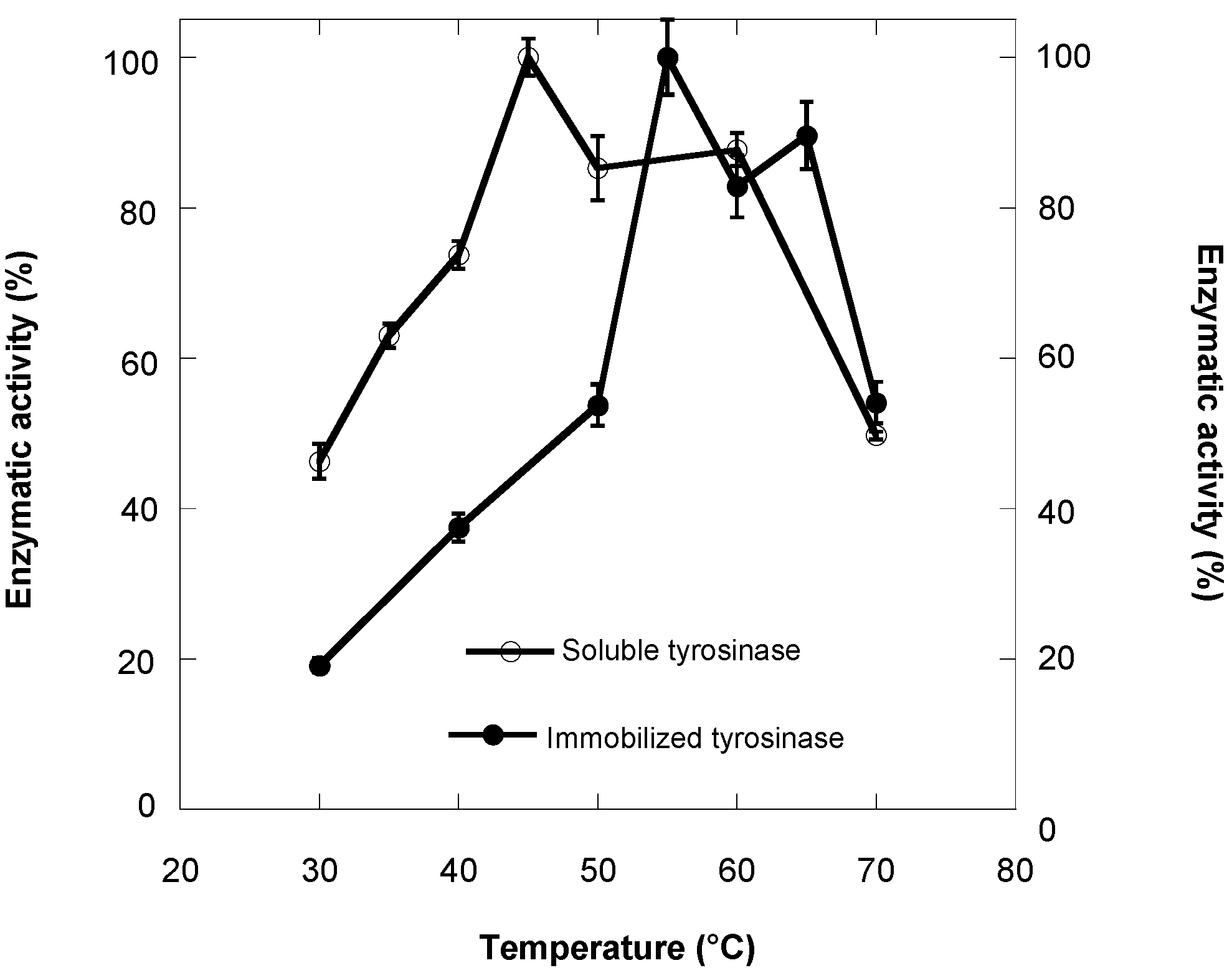 3.2.5. Effect of Temperature on Soluble and Immobilized Tyrosinase