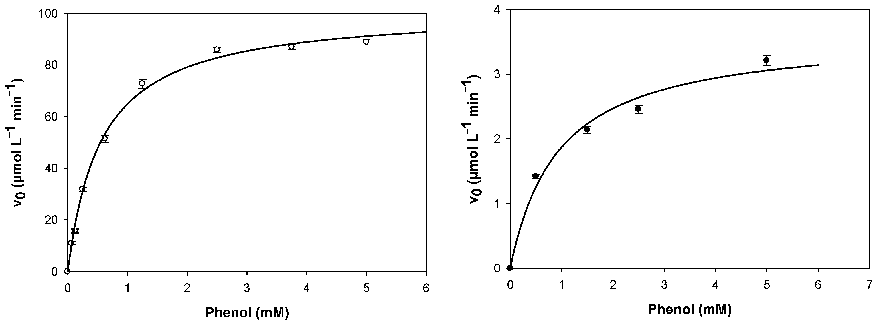 - Fenoll, L.G.; Rodriguez-Lopez, J.N.; Garcia-Molina, F.; Garcia-Canivas, F.; Tudela, J. Michaelis constants of mushroom tyrosinase with respect to oxygen in the presence of monophenols and diphenols. Int. J. Biochem. Cell Biol. 2002, 34, 332–336. [Google Scholar] [CrossRef] [PubMed]
