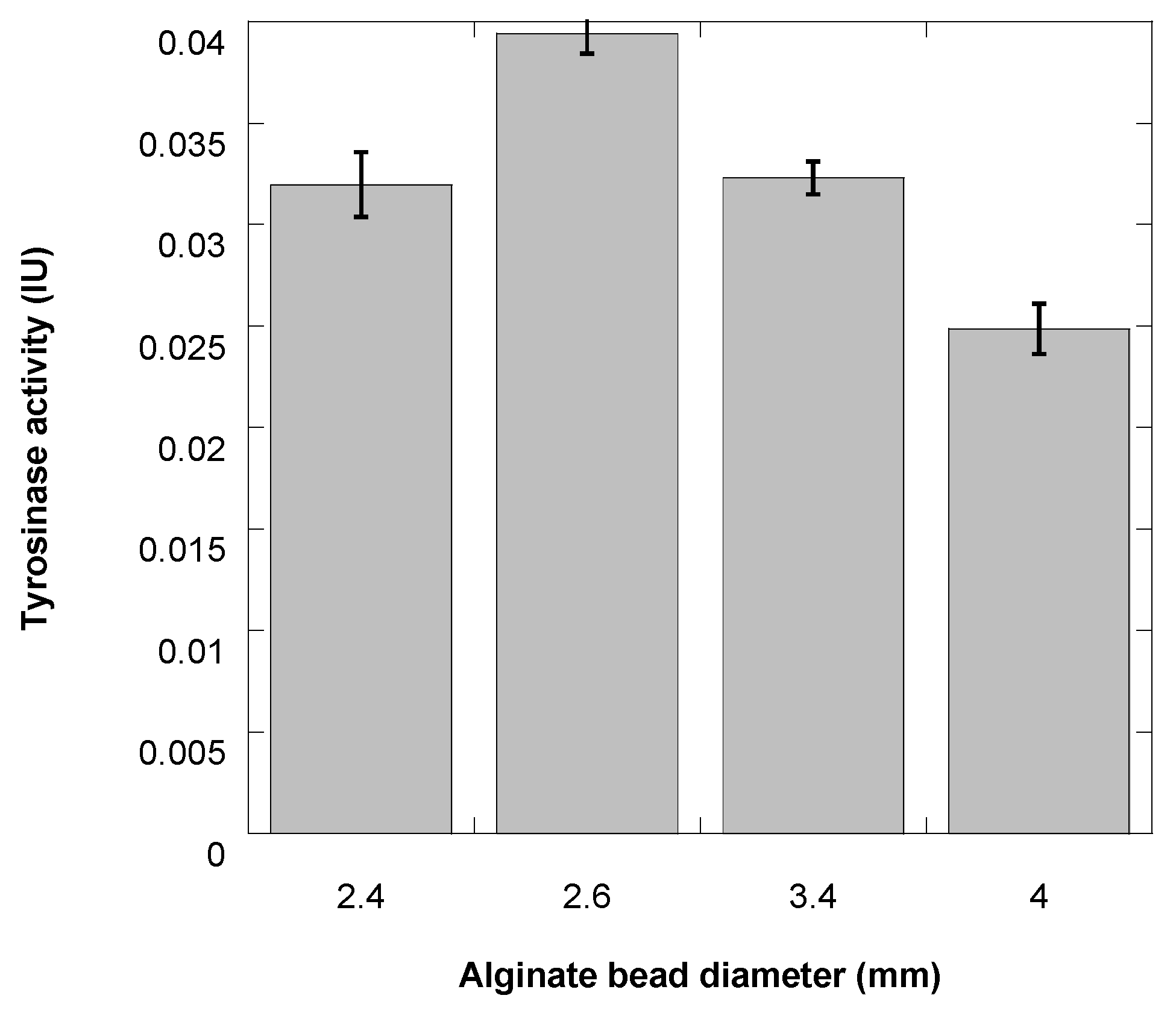 3.2.7. Effect of Tyrosinase Ca-Alginate Bead Size