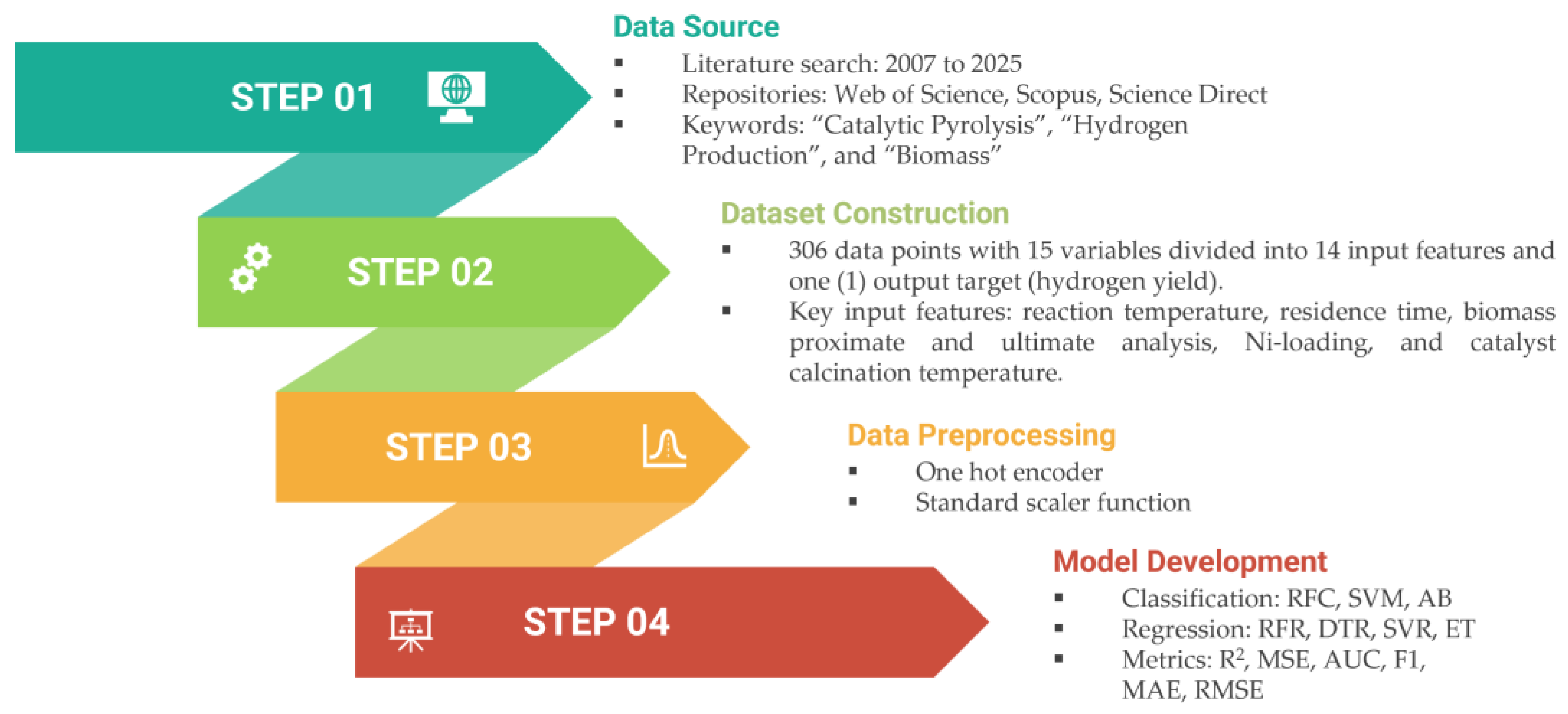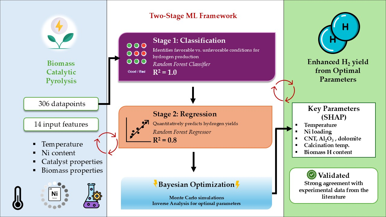 - Persaud, V.V.; Hamrani, A.; Uzzi, M.; Munroe, N.D.H. Machine Learning-Guided Optimization of Nickel-Based Catalysts for Enhanced Biohydrogen Production through Catalytic Pyrolysis of Biomass. Int. J. Hydrogen Energy 2025, 144, 1085–1094. [Google Scholar] [CrossRef]