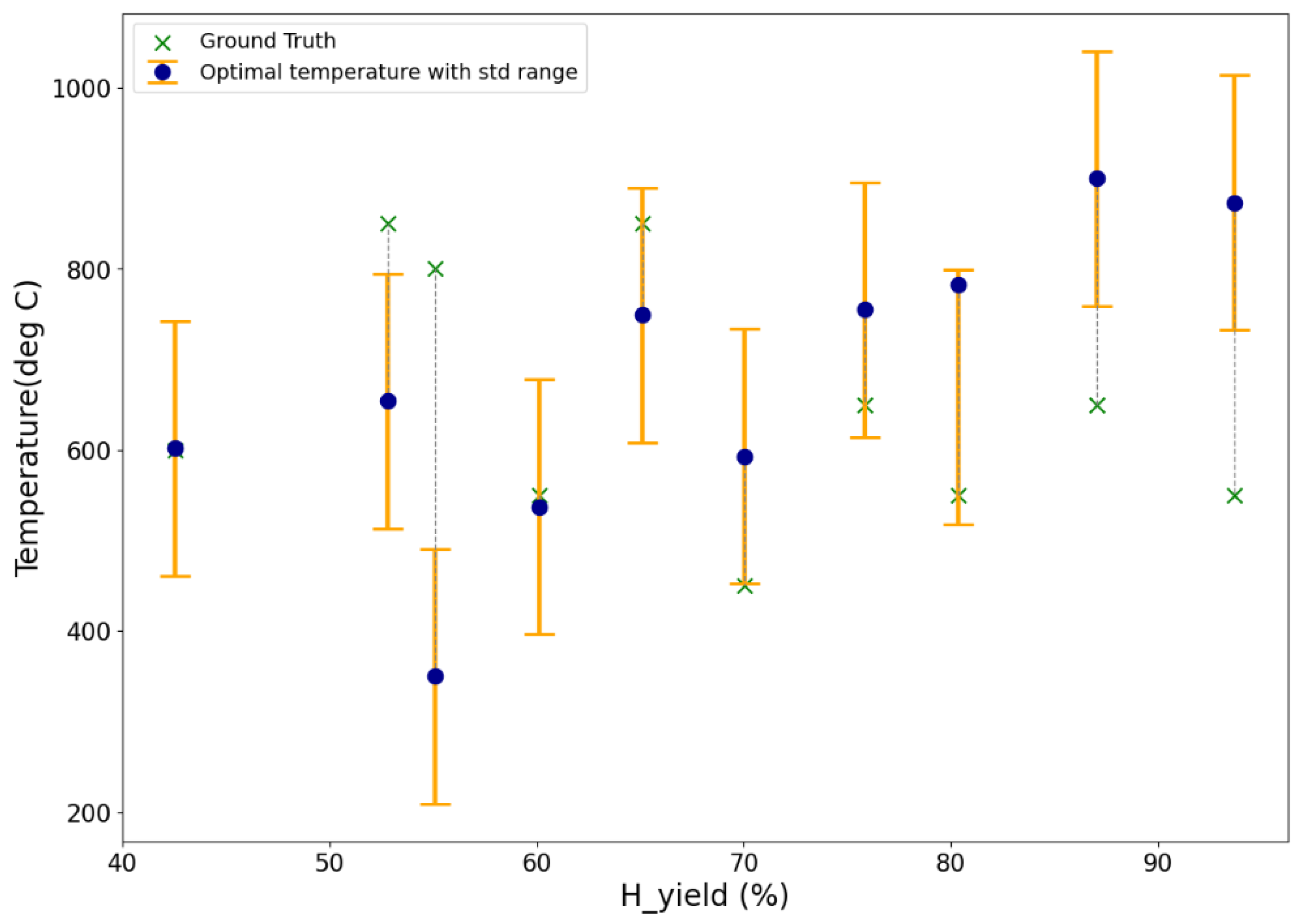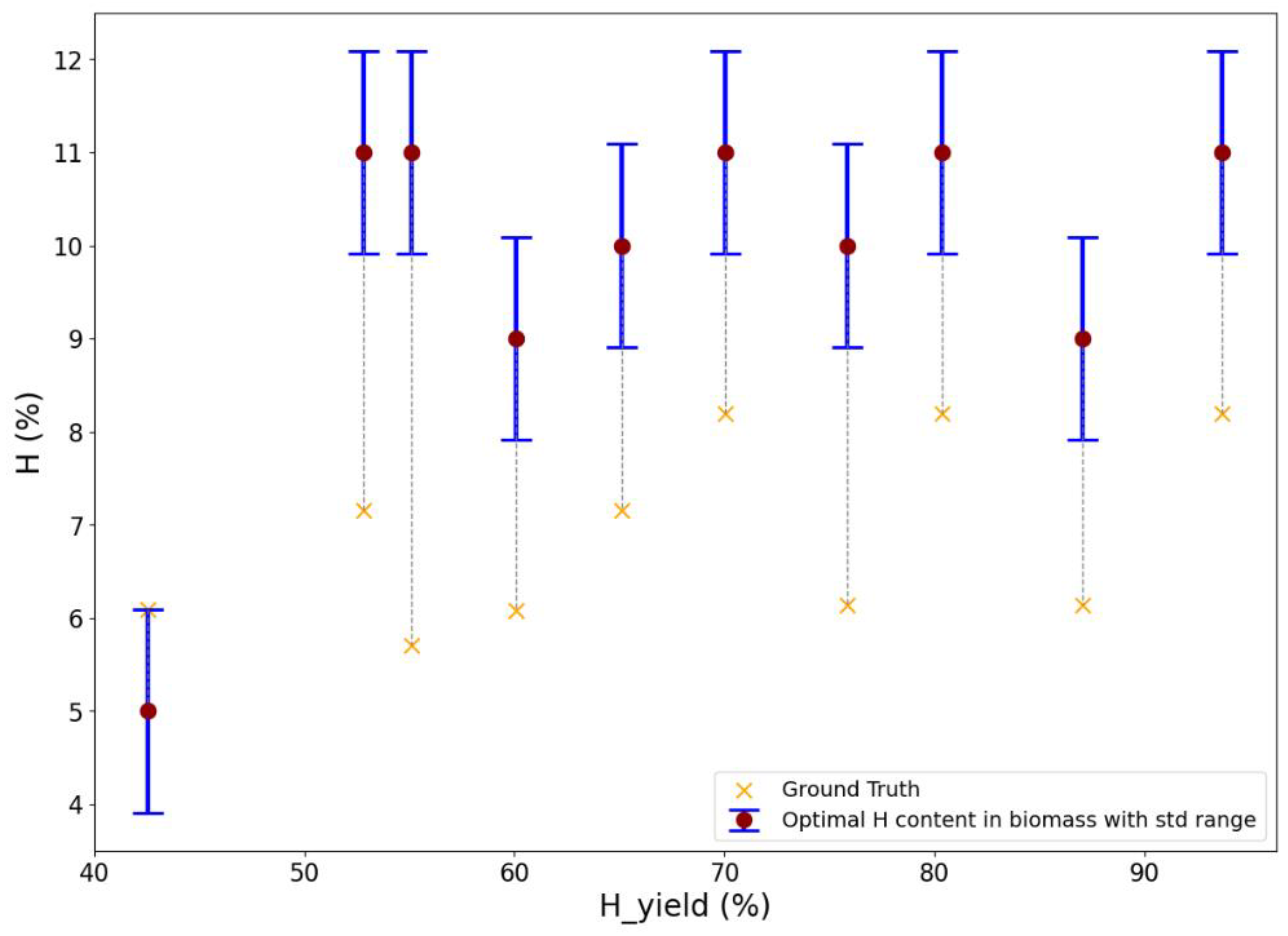 | H Yield (vol%) | Ni Loading (wt%) | Support | Cal. Temp (°C) | Biomass H Content (wt%) | Temperature (°C) | Ref. |
