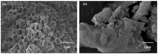 SEM images of biochar (a) and microbial-loaded biochar (b).