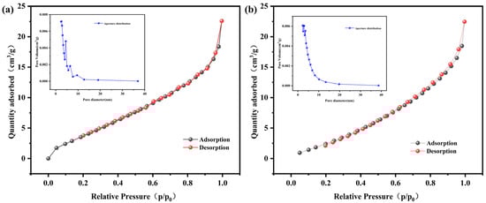 The surface morphologies of BC and BLBC were examined using scanning electron microscopy (SEM). As shown in Figure 1a, the pristine BC surface was relatively smooth, displaying the characteristic porous, gully-like structure resulting from the pyrolysis of plant straw [22], with a limited presence of naturally adhered mineral particles. In contrast, the microscopic morphology of BLBC revealed significant alterations (Figure 1b). Well-defined bacterial cells were observed on the biochar surface, which was further decorated with granular substances of varying sizes, appearing in both agglomerated and dispersed forms. This complex morphology reflects the interactive features between the biochar and the immobilized bacterial components, confirming successful microbial loading. The N2 adsorption–desorption isotherms of both BC and BLBC exhibited overall type-II characteristics, with a slight hysteresis loop observed in the high relative pressure region. For BC, the weak hysteresis loop and low specific surface area might be attributed to its dominant large pores or interconnected macropores, which are less accessible to N2 molecules, leading to a discrepancy between the SEM-observed macroscopic porous morphology and BET-measured surface area. This phenomenon is common in plant-derived biochars pyrolyzed at relatively low temperatures (300 °C), where macropores from the original straw structure are retained but contribute minimally to N2 adsorption capacity. Pore size distribution analysis confirmed the predominance of mesoporous structures in both materials (Figure 2), which is consistent with typical mesoporous adsorbents [23,24]. The specific surface area of BC was measured at 41.48 m2/g, with a total pore volume of 0.032 cm3/g and an average pore width of 6.54 nm. After bacterial modification, the specific surface area of BLBC increased markedly to 58.06 m2/g, while the pore volume and average pore width remained largely unchanged (0.032 cm3/g and 6.58 nm, respectively). Although the isotherm shapes and pore size distribution curves of BC and BLBC appear similar, the significant increase in specific surface area of BLBC (≈40%) directly reflects the optimization of pore accessibility by bacterial loading—bacterial cells and their metabolites might fill partial macropore channels or attach to pore walls, converting some inaccessible macropores into N2-accessible mesopores. This explains the distinct morphological features observed by SEM (bacterial attachment and surface roughness) while maintaining similar pore size distribution trends. This notable increase in surface area aligns with the morphological changes observed via SEM and collectively verifies the successful optimization of the material’s physical structure through bacterial loading. It should be noted that a limitation of this study is the absence of precise quantitative data on the bacterial load immobilized on the biochar. This stems from the practical difficulty in accurately enumerating cells attached to or entrapped within the complex porous network of biochar using conventional detachment and plating methods, which may underestimate viable cell counts. Future work should employ culture-independent quantification techniques, such as qPCR targeting bacterial genes, or direct imaging approaches to establish a clear correlation between immobilized cell density and the system’s functional performance.