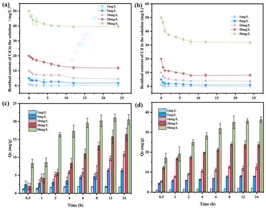Cd(II) adsorption properties at different initial concentrations: (a) residual concentration over time for BC, (b) residual concentration over time for BLBC, (c) adsorption capacity of BC, and (d) adsorption capacity of BLBC.