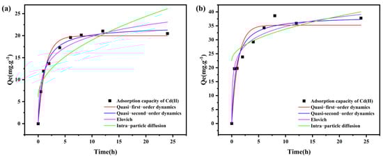 Adsorption kinetics fitting for BC (a) and BLBC (b).