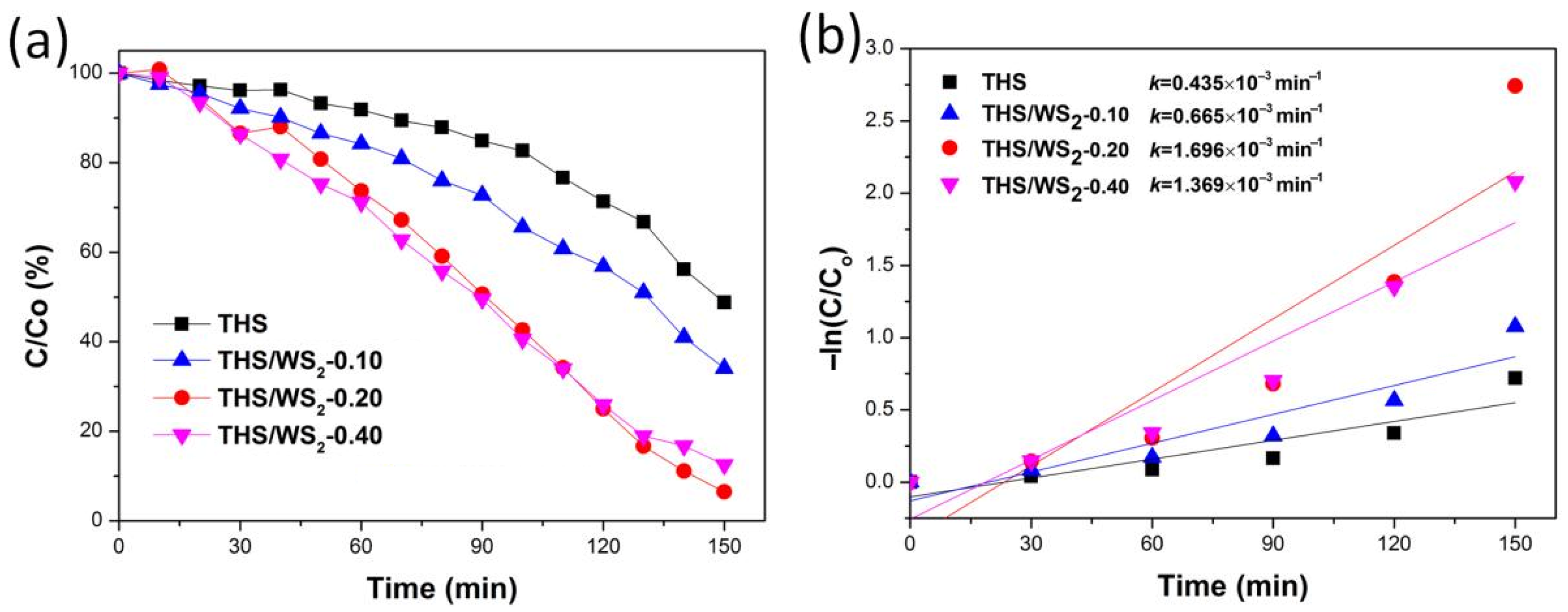 2.8. Analysis of Photocatalytic Degradation of RhB by THS/WS2