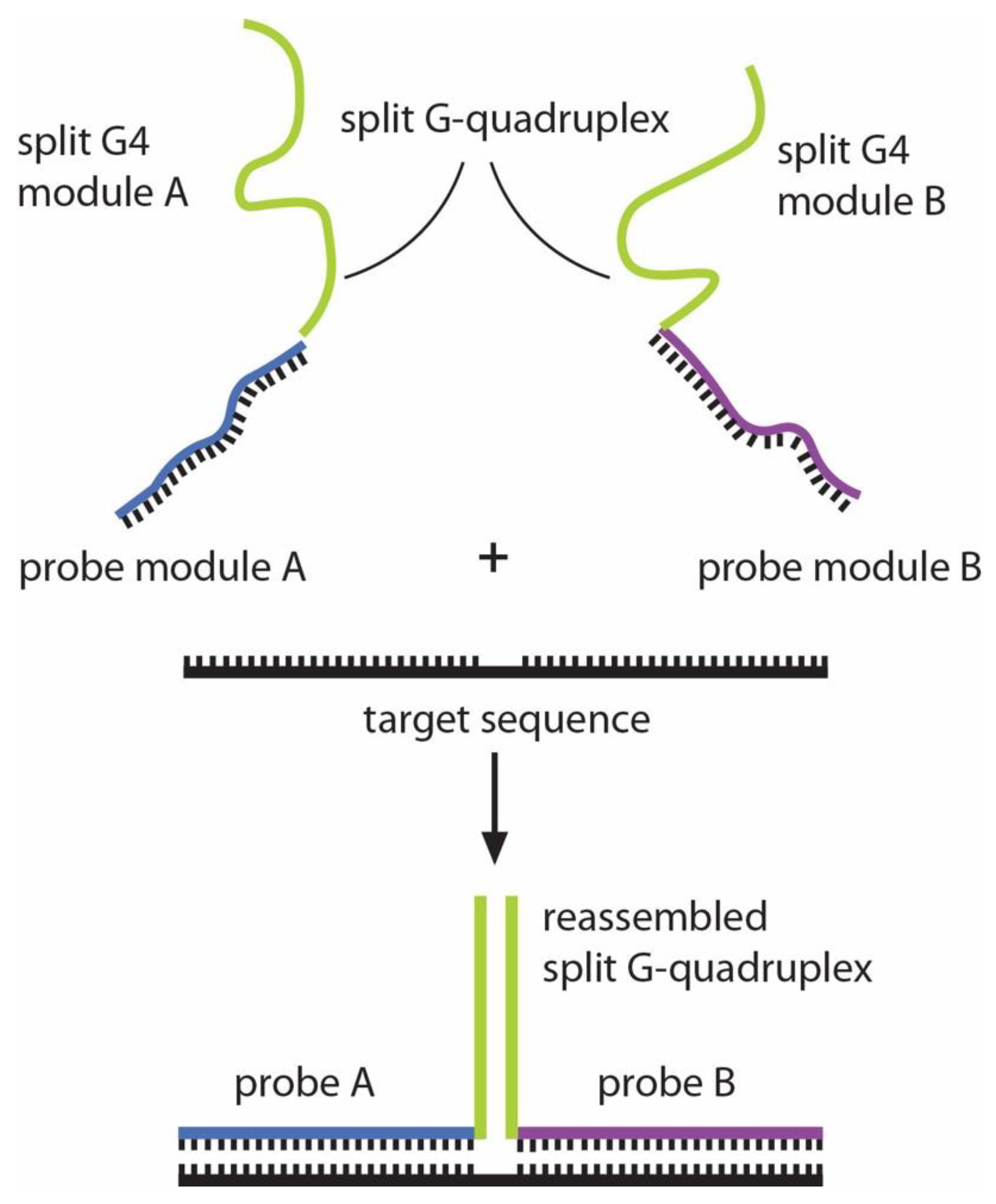 - Connelly, R.P.; Verduzco, C.; Farnell, S.; Yishay, T.; Gerasimova, Y.V. Toward a Rational Approach to Design Split G-Quadruplex Probes. ACS Chem. Biol. 2019, 14, 2701–2712. [Google Scholar] [CrossRef]