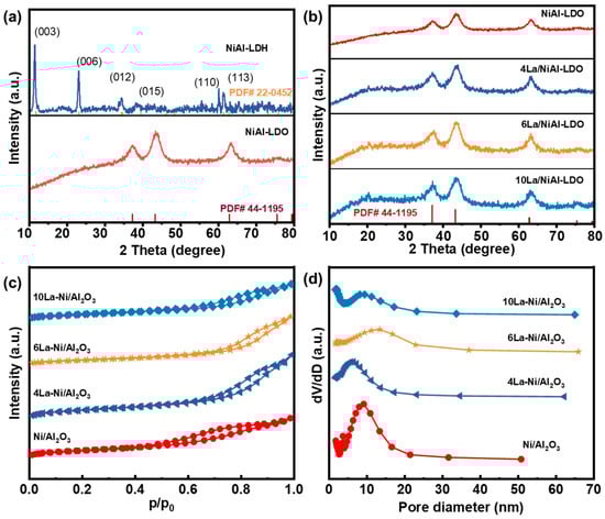 XRD patterns for (a) NiAl-LDA, NiAl-LDO and their PDF#, (b) samples, (c) N2 adsorption–desorption isotherms, and (d) pore size distribution of NiAl-LDO, 4La/NiAl-LDO, 6La/NiAl-LDO, and 10La/NiAl-LDO.