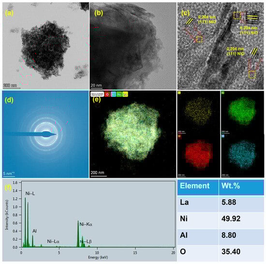 (a,b) TEM, (c) HRTEM, (d) selected area electron diffraction pattern, (e) HAADF-STEM image and (f) corresponding elemental mapping images of the 6La/NiAl-LDO catalyst precursor.