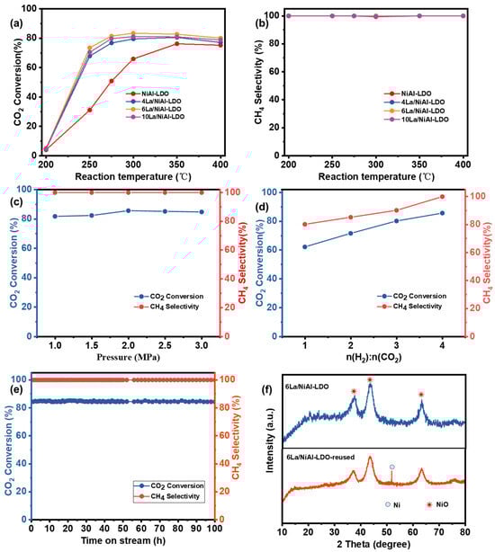 (a) CO2 conversion and (b) CH4 selectivity of reaction temperature over NiAl-LDO, 4La/NiAl-LDO, 6La/NiAl-LDO, and 10La/NiAl-LDO; CO2 conversion, and CH4 selectivity of (c) reaction pressure, (d) mole ratio of n (H2) to n (CO2) over 6La/NiAl-LDO, (e) long-term stability evaluation in the CO2 methanation over 6La/NiAl-LDO, and (f) XRD patterns of 6La/NiAl-LDO and 6La/NiAl-LDO-used.