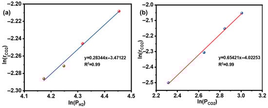 The CO2 conversion was measured at different concentrations of H2 or CO2, and the corresponding reaction rates were calculated using Equation (2). The relationship between the logarithm of the reaction rate and the logarithm of the partial pressure of CO2 or H2 is shown in Figure 8. When the partial pressure is fixed and the partial pressure is changed, the slope in Figure 8a is reaction order x of H2. Similarly, when the partial pressure is fixed and the partial pressure is changed, the slope in Figure 8b is reaction order y of CO2. The sum of the positive reaction orders for H2 and CO2 is (x + y). The slopes of the linear fits to the data points give the reaction orders with respect to each reactant. The sum of the positive reaction orders for H2 and CO2 (x + y) was found to be 0.93, approximately equal to 1, indicating that the positive reaction follows first-order kinetics.