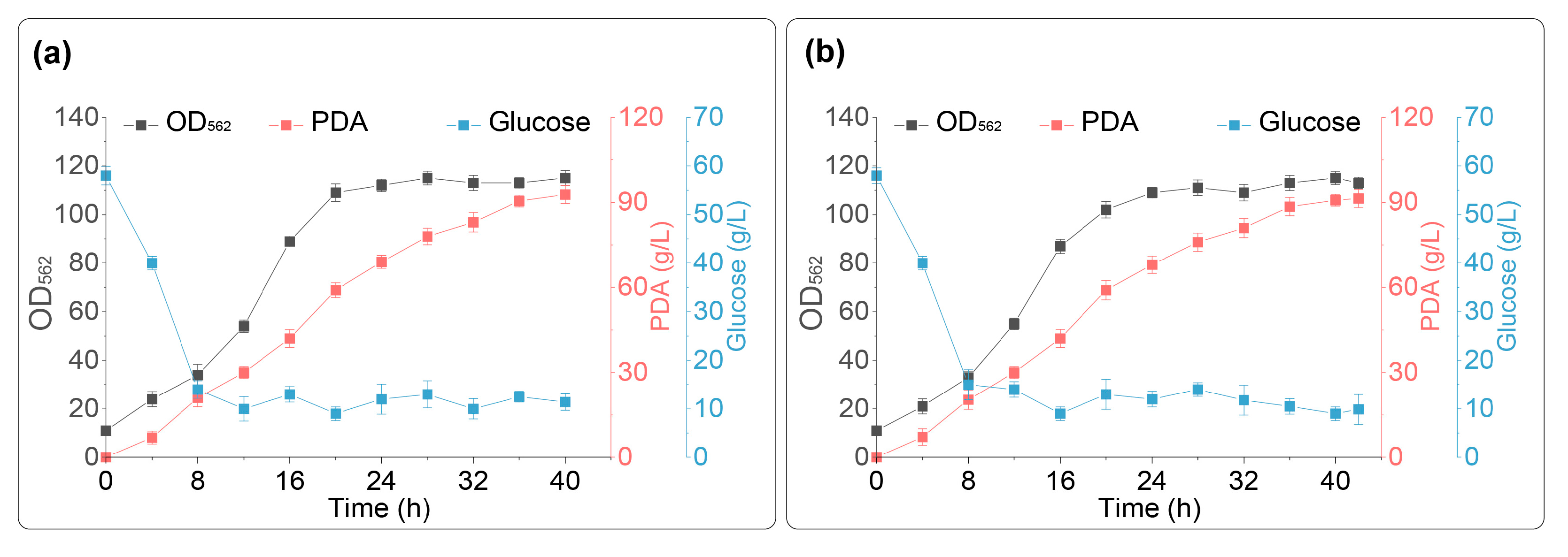 2.1. Construction of a PDA-Producing Strain via Strengthening the Lysine Synthesis Pathway