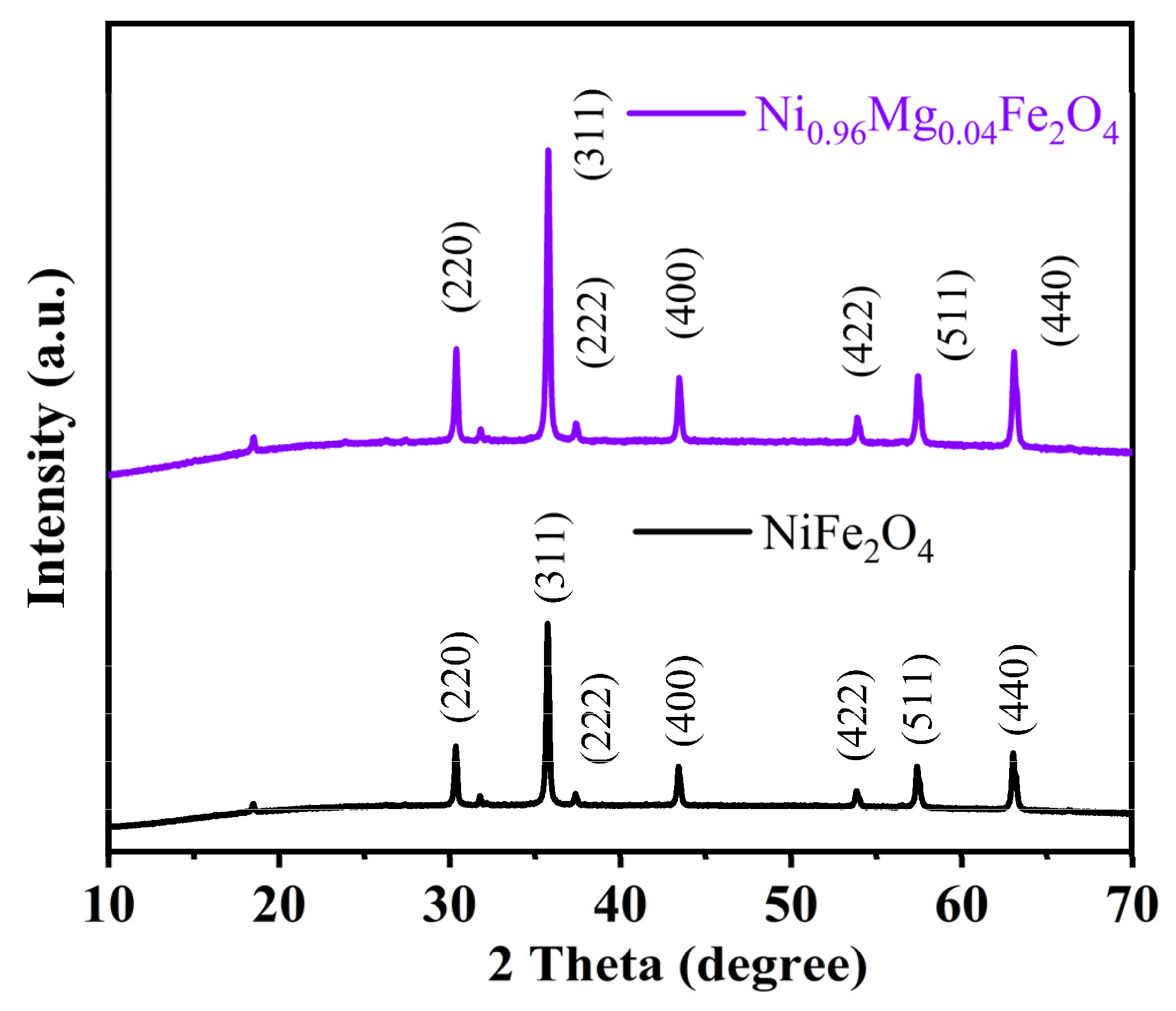 For Ni0.96Mg0.04Fe2O4, the same protocol was employed but the total (Ni2+ + Mg2+) to Fe3+ concentration ratio was maintained at 1/2, and Mg(NO3)2·6H2O was introduced to achieve 4% Mg substitution on the Ni sites. The resulting Mg-modified sample was processed identically (washing, drying and calcination) to ensure comparability.